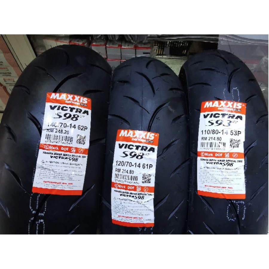 Maxxis Tires Maxxis Victra S98 F1 Tubeless Tyre 6080 7090 7080 8090 9080 11070 12070 14070-14 Soft Compound Tayar 14 Nvx RM 7400 RM 7790 5 Dr Motor. Joined Feb 20 2009 Messages 107 Reaction score 0. Menjual secara runcit dan borong tayar second motorsikal kapcai dan SBK.